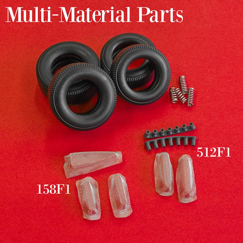 kit multi-matériaux  détaillé comportant du métal blanc, résine, photodécoupes ,pièces tournées en aluminium, pneus en caoutchouc sérigraphiques et divers fils,câbles et durites permettant une représentation maximale du véhicule d’origine. l