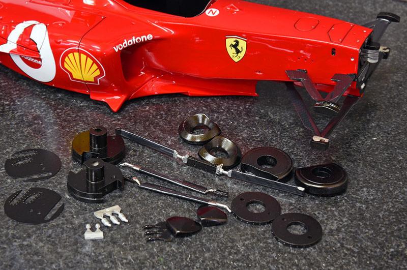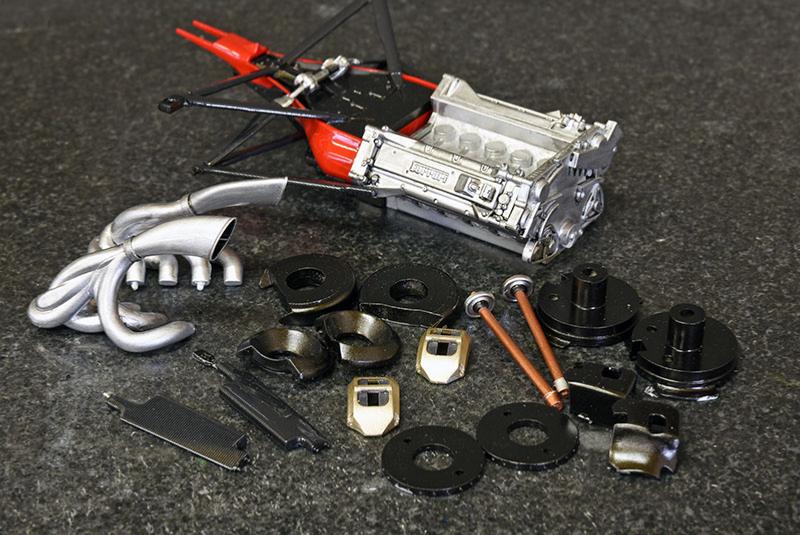 kit multi-matériaux  détaillé comportant du métal blanc, résine, photodécoupes ,pièces tournées en aluminium, pneus en caoutchouc sérigraphiques et divers fils,câbles et durites permettant une représentation maximale du véhicule d’origine. l