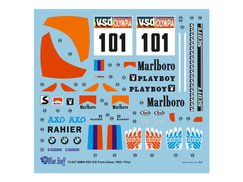 DECAL 1/12 - PILOTE BMW R80 G/S PARIS DAKAR 1985 - BLUE STUFF - BS12-047
